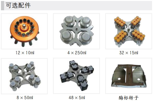 9、航空锻造铝转子(仅限角转子)及多种聚酰胺纤维适配器可选,适用于0.2mL至250mL离心管或试剂瓶;可离心各类MTP微孔板、PCR板、细胞培养板和深孔板。